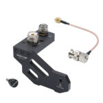Die Halterung aus gefrästem, eloxiertem Aluminium wird seitlich an das IC-705 geschraubt und dient dann als Ständer und Antennenhalter für das Gerät. Zur Aufnahme der Antenne dient die PL-Buchse. Außerdem ist eine Bananenbuchse für die Erdung auf der Halterung.